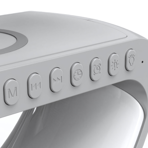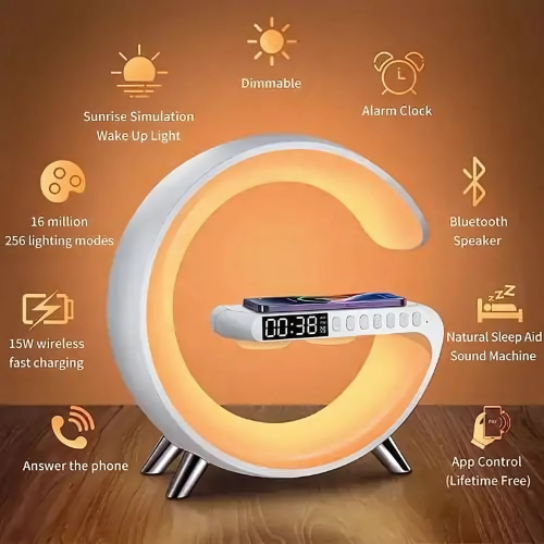 Yeh Wireless G-Shape Charging Speaker ek digital alarm clock, built-in lights aur dimmable LED light ke saath aata hai. Multifunctional aur portable design – nightlight aur speaker dono ka kaam karta hai, perfect for bedside use!